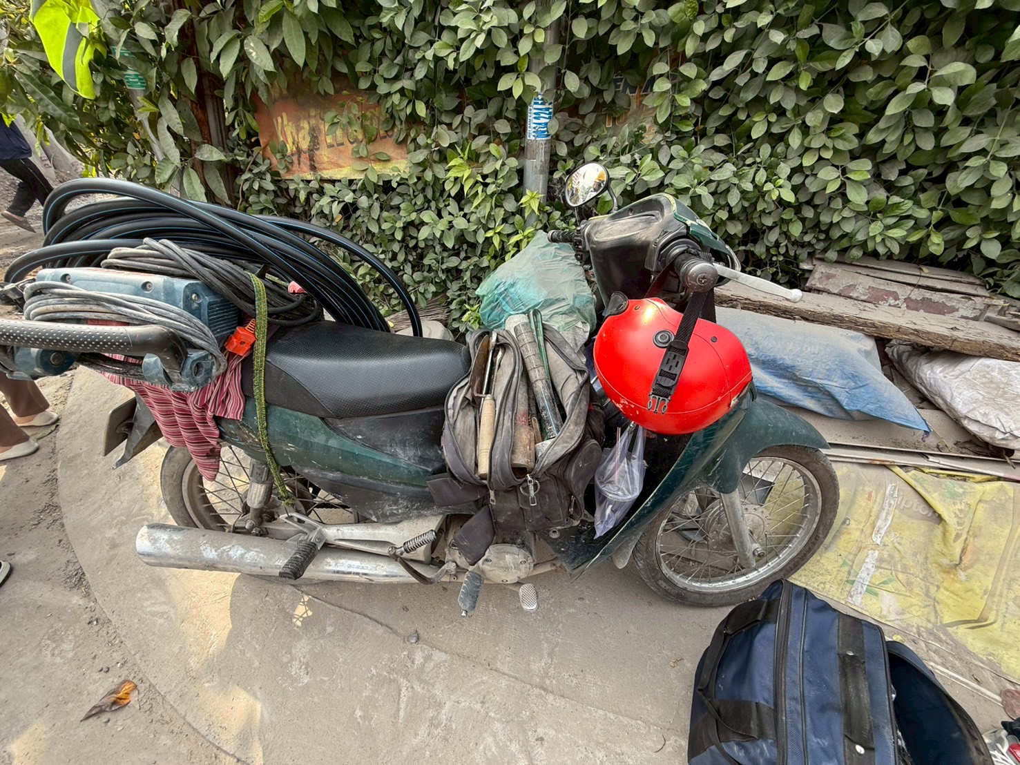 バイクにホースやシャベル・工具など大量の道具を