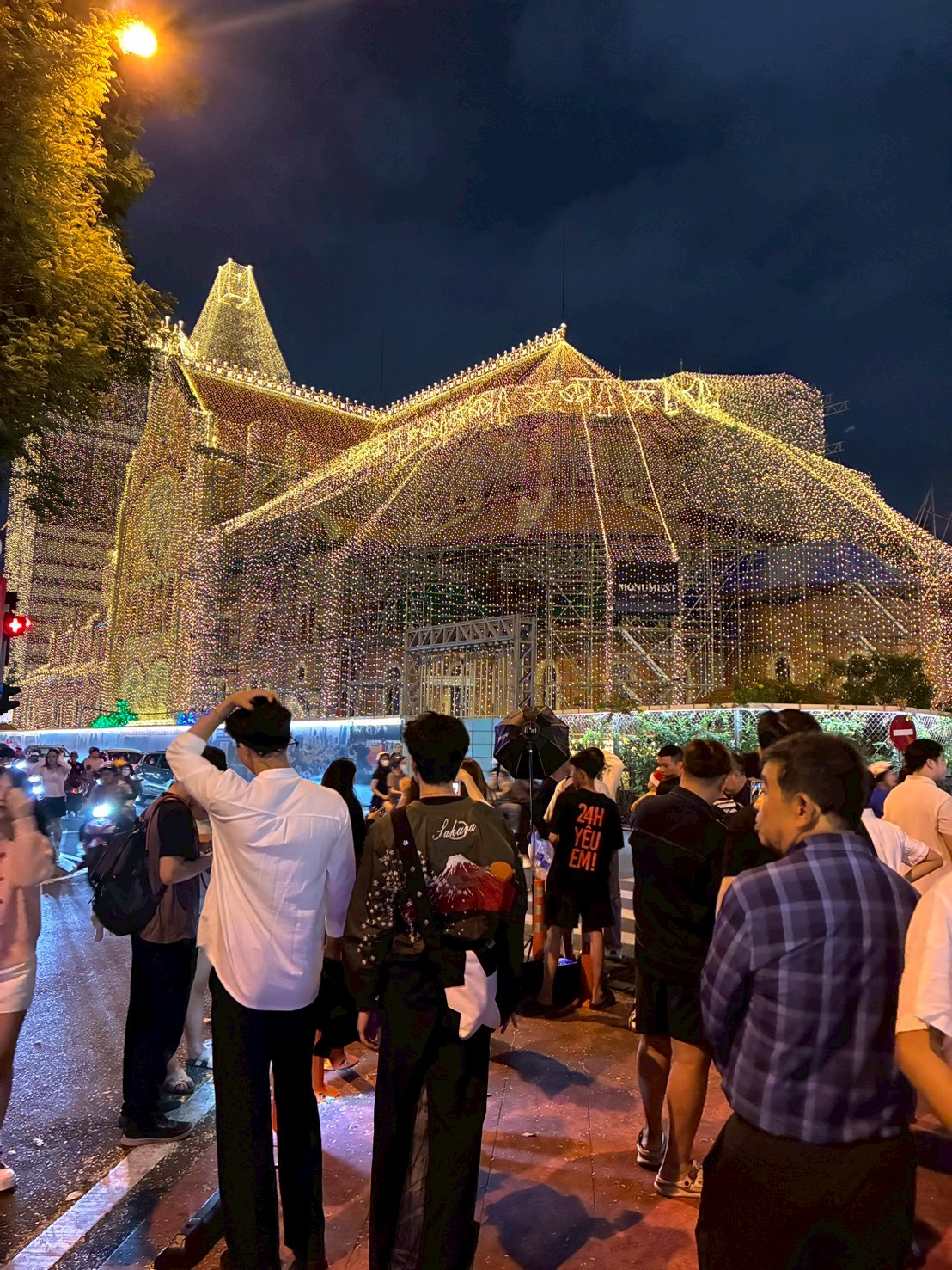 ★仲良く歩くハオさんとクアンさん(左)・教会のイルミネーションとその周辺(中央・右)