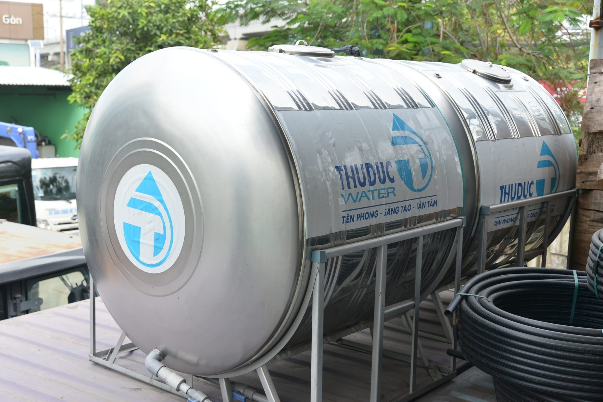 ★材料倉庫の中(左)・パイプ置場(中央)・外のコンテナの上にあるタンク(右)
