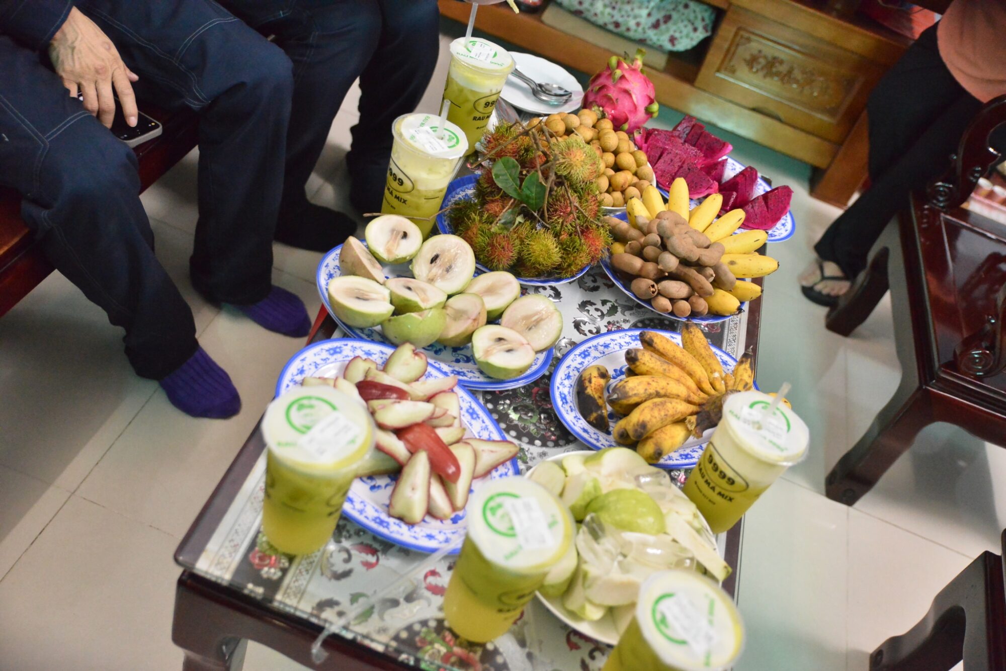 ★豪華なフルーツとジュース(左)とハオさんのご実家で採れたモンキーバナナ(右)